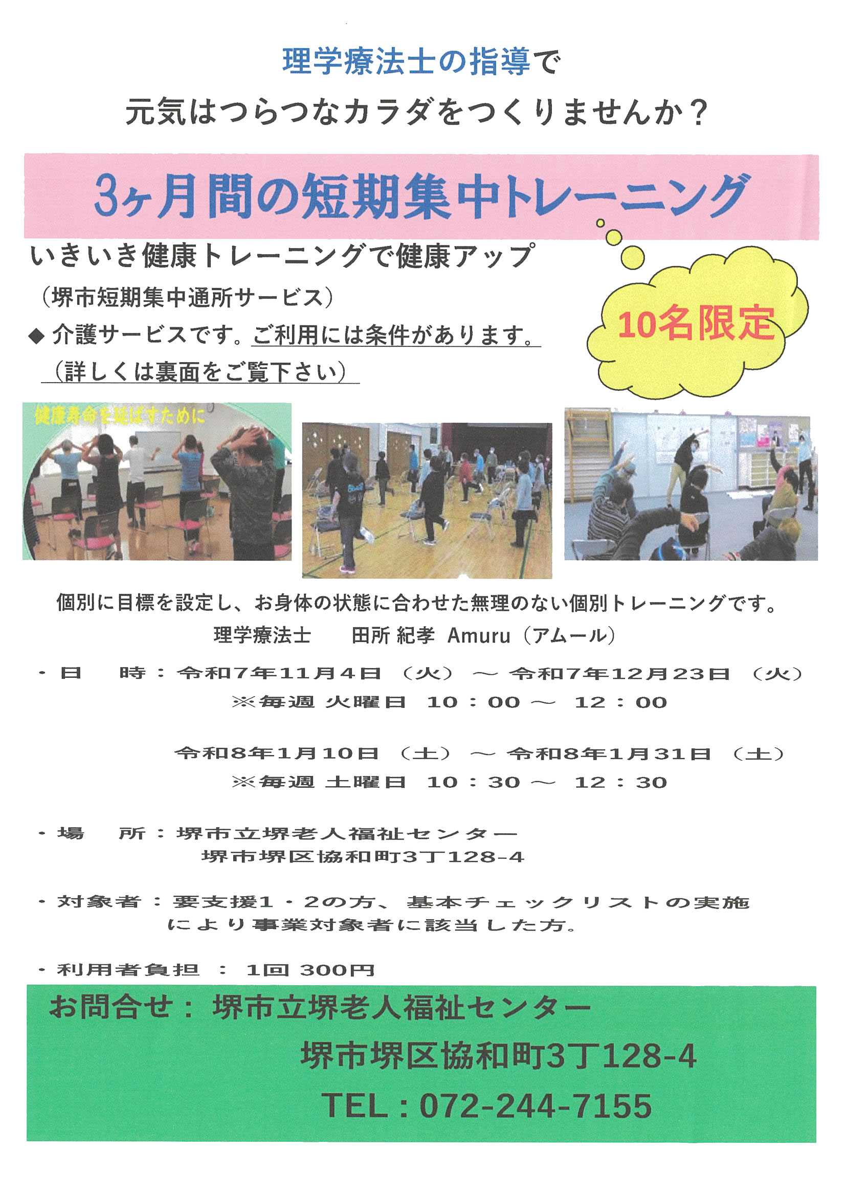 対象 | 堺市堺区・西区在住で要支援1・2のの方または事業対象の方 ※事業対象の方とは、地域包括支援センター、ケアマネージャーによる基本チェックリストで利用対象となった方 |