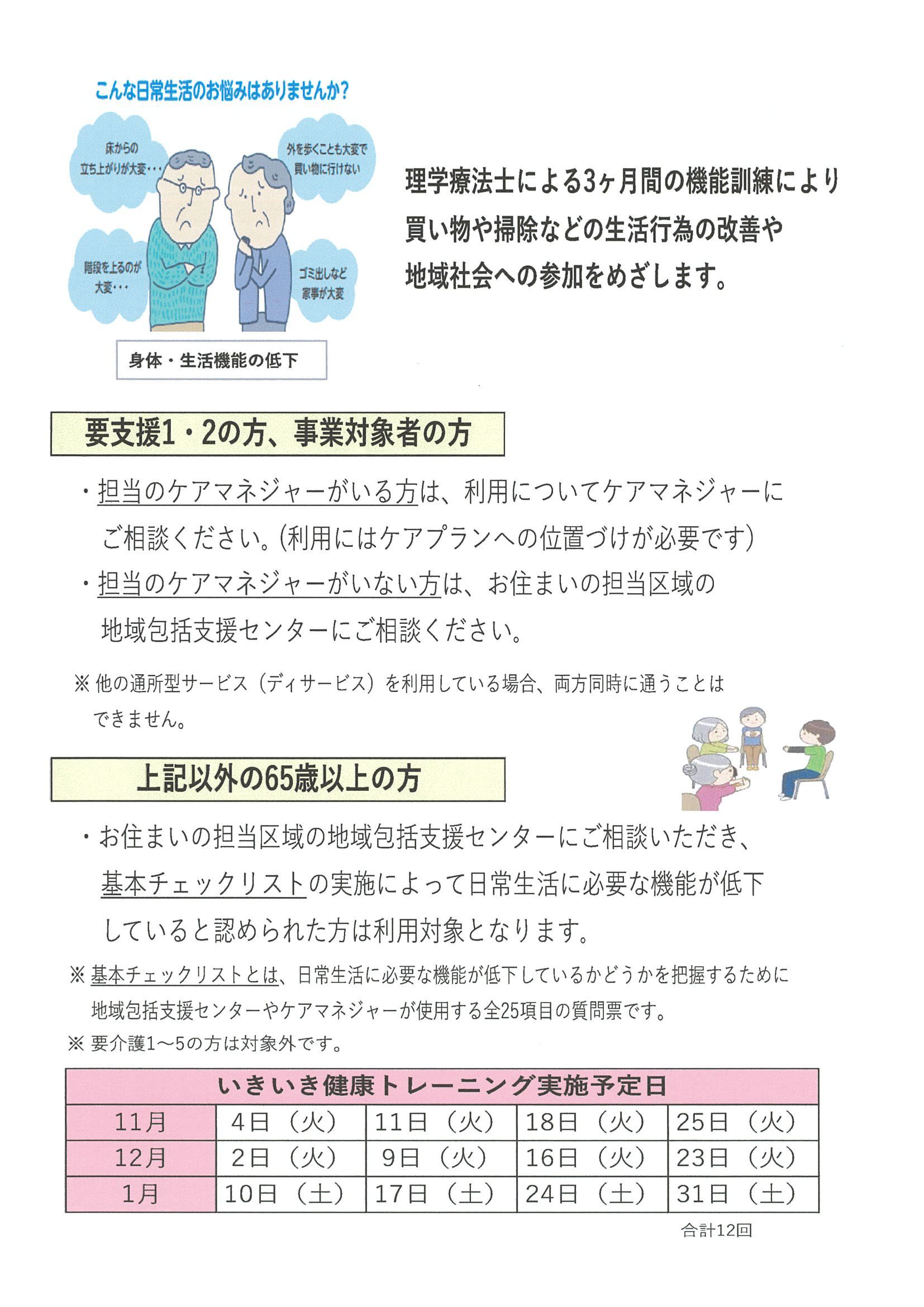 理学療法士による3ヶ間の機能訓練により買い物や掃除などの生活行為の改善や地域社会への参加を目指します。